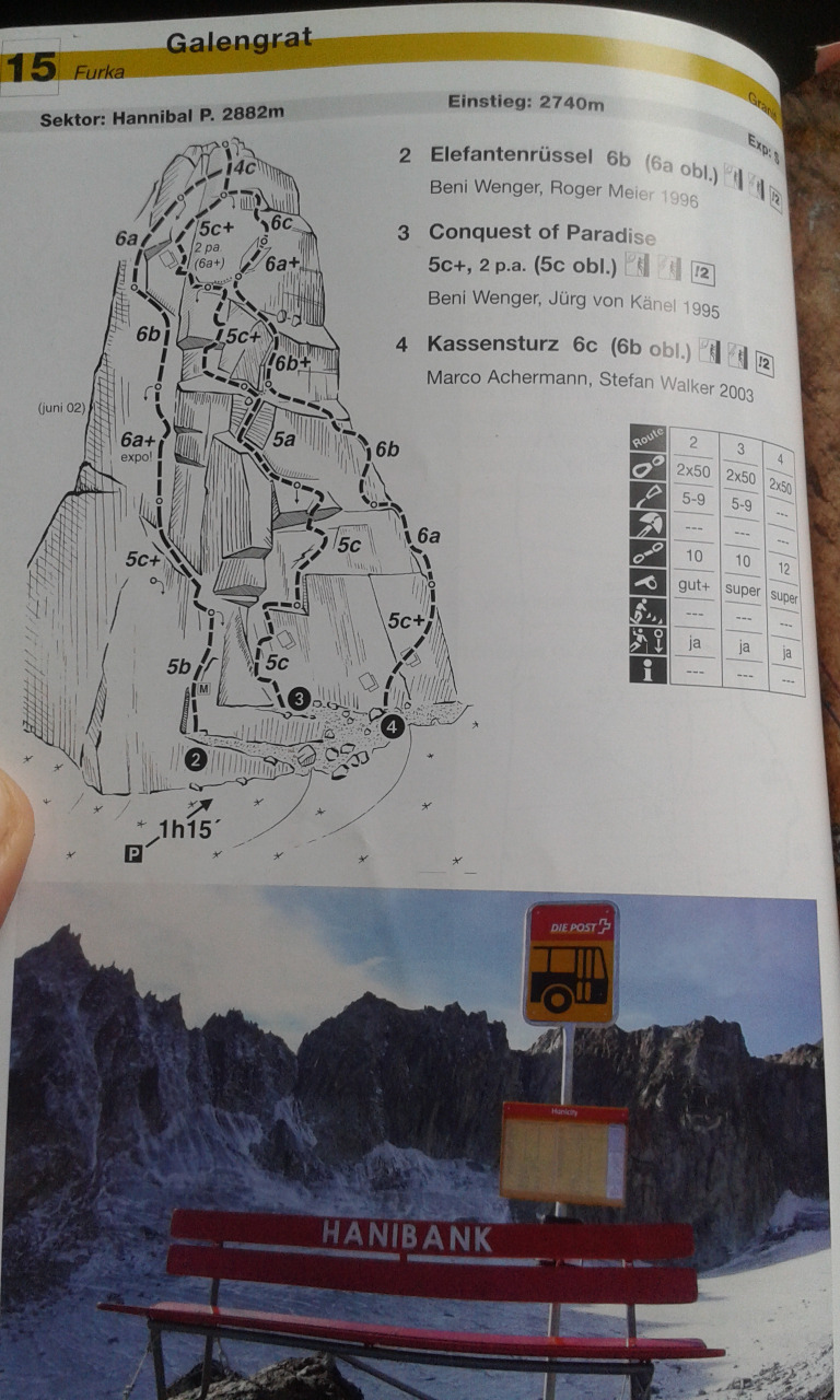 Die ambitionierte Halbtagestour mit Hochtourencharakter starteten wir um halb 12 in Emmen. Aufgrund von Baustellen und viel Touriverkehr gestaltete sich die Anfahrt nicht so schnell wie erhofft. Knapp 2h brauchten wir für die Anfahrt zum Pass. Dafür konnten wir die Zustiegszeit mit 50min leicht unterbieten. Einstieg fanden wir umgehend, die Routen sind alle angeschrieben. Auch herrschte entsprechend dem Wetter und der Ferienzeit recht reger Betrieb. Lediglich in unserer Route waren wir alleine. Die erste Länge mit 5c+ war gutes Warmup wenn auch dei Hakenabstände nicht ganz so super sind wie beschrieben. Dafür ist der rötlich- gelbe Granit Hammergut. Hammermässig ist dann auch die 4. SL mit einer 6b+ Verschneidung und plattigem Ausstieg. In der 5. SL heisst es dann Piazen ohne Ende in einer super Verschneidung die nach oben stark aufsteilt. Leider ist diese Länge zu schnell zu Ende. In der 6. SL geht es dann vom Stand weg sehr steil über ein Dach mit einem überhängenden Ausstiegsriss. Einfach bockstark. Und das ganze mit viel Luft unter dem Hinterteil. Die letzten Länge ist als Cooldown sehr gut zu gebrauchen. Auf der Hanibank am Gipfel war wieder allerhand los. Bei der neuesten Aktion (Postkarten vom Gipfel) beteiligten wir uns auch und schrieben eine Postkarte an unsere Liebsten. Sind wir gespannt ob diese je ankommen.